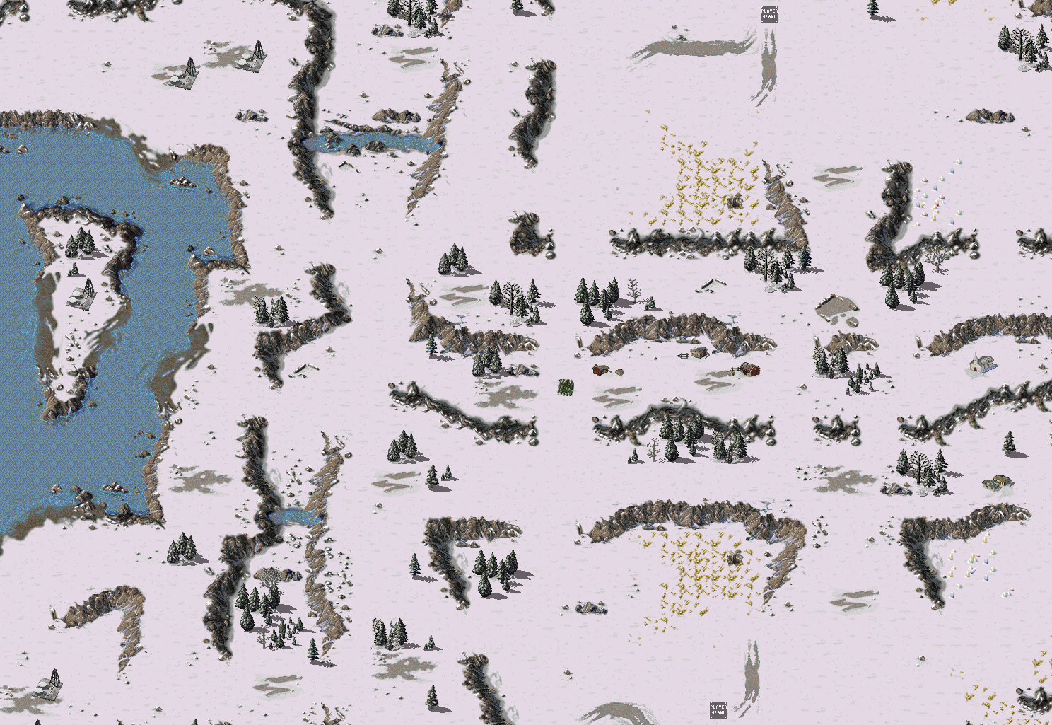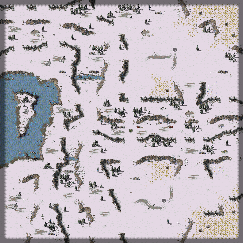 1v1. Snow covered mountain passes. 5 derricks. 64 x 64.