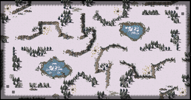 Very tight map. You are supposed to move out before deploying the MCV. There are strategical locations to control. There are various small ore patches and two oil pumps on the field.