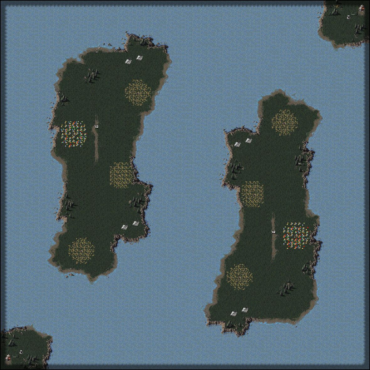 Two small islands have neutral nuke silos and creep flame turret and power plant.