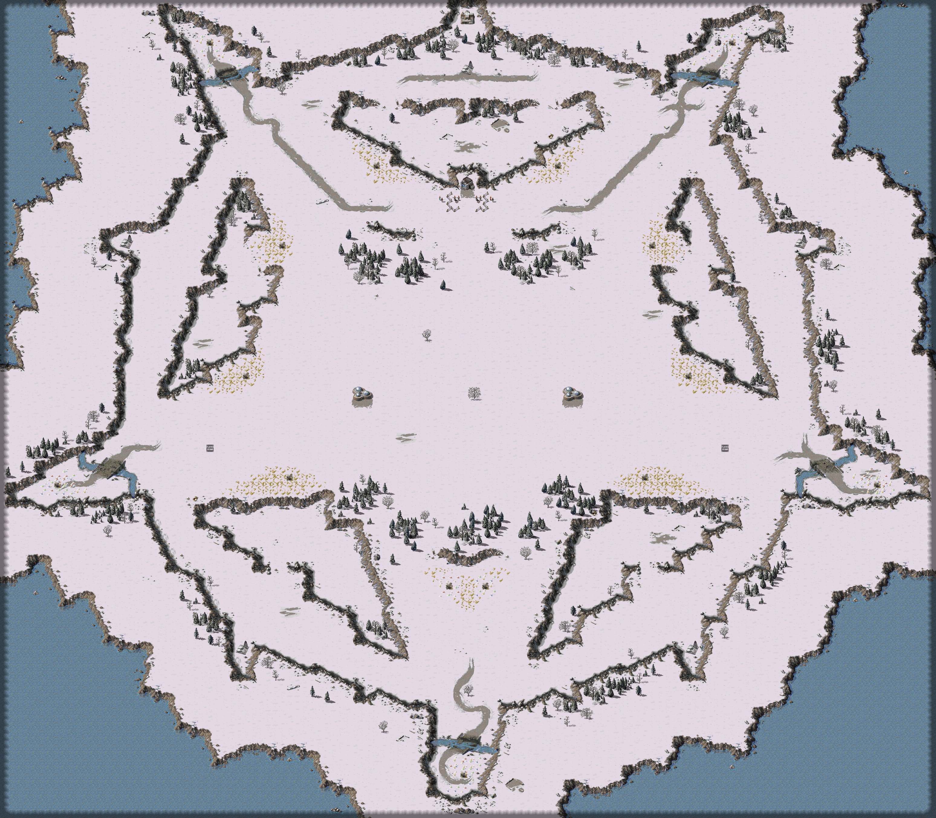 other than that, only actual gripe about this map is if its an ally vs rusky player. man if that ally is smart, they can chrono mcv on the cliff edge and arty them to death. assuming majority of enemy ruskie base is along the edges where the good gem resources are. but its a nice wide open map so i don't think that'll have too much of an effect. except for possibly drawing out a battle since the ruskies only got planes and v6s to attempt to shoot out any allies on the cliffs