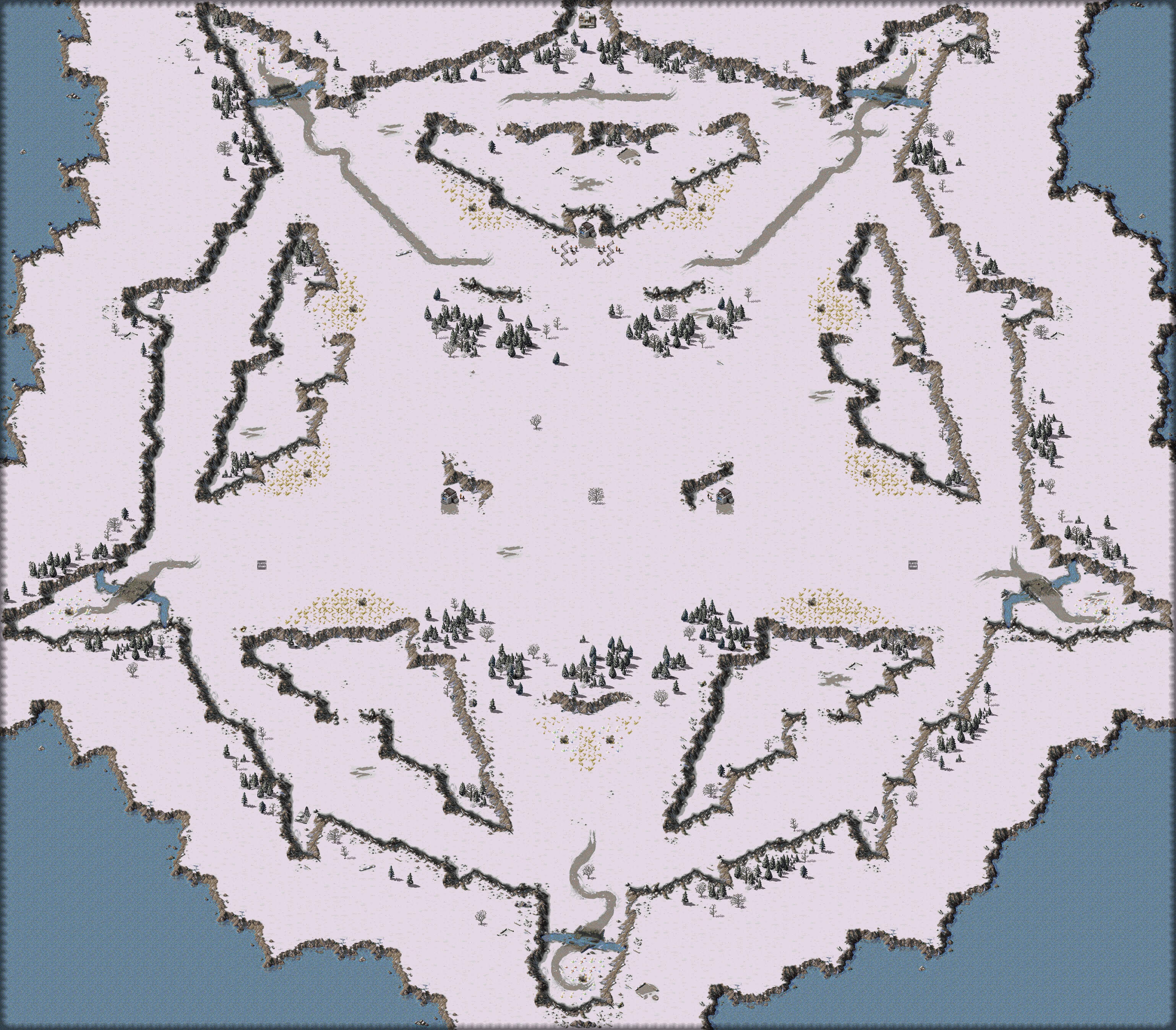 other than that, only actual gripe about this map is if its an ally vs rusky player. man if that ally is smart, they can chrono mcv on the cliff edge and arty them to death. assuming majority of enemy ruskie base is along the edges where the good gem resources are. but its a nice wide open map so i don't think that'll have too much of an effect. except for possibly drawing out a battle since the ruskies only got planes and v6s to attempt to shoot out any allies on the cliffs