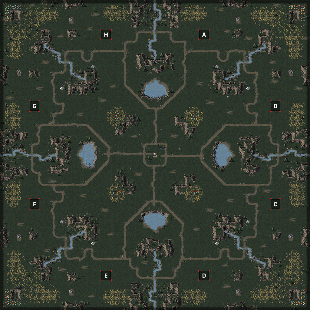 Skirmish map for 4v4, 2v2v2v2 or FFA.