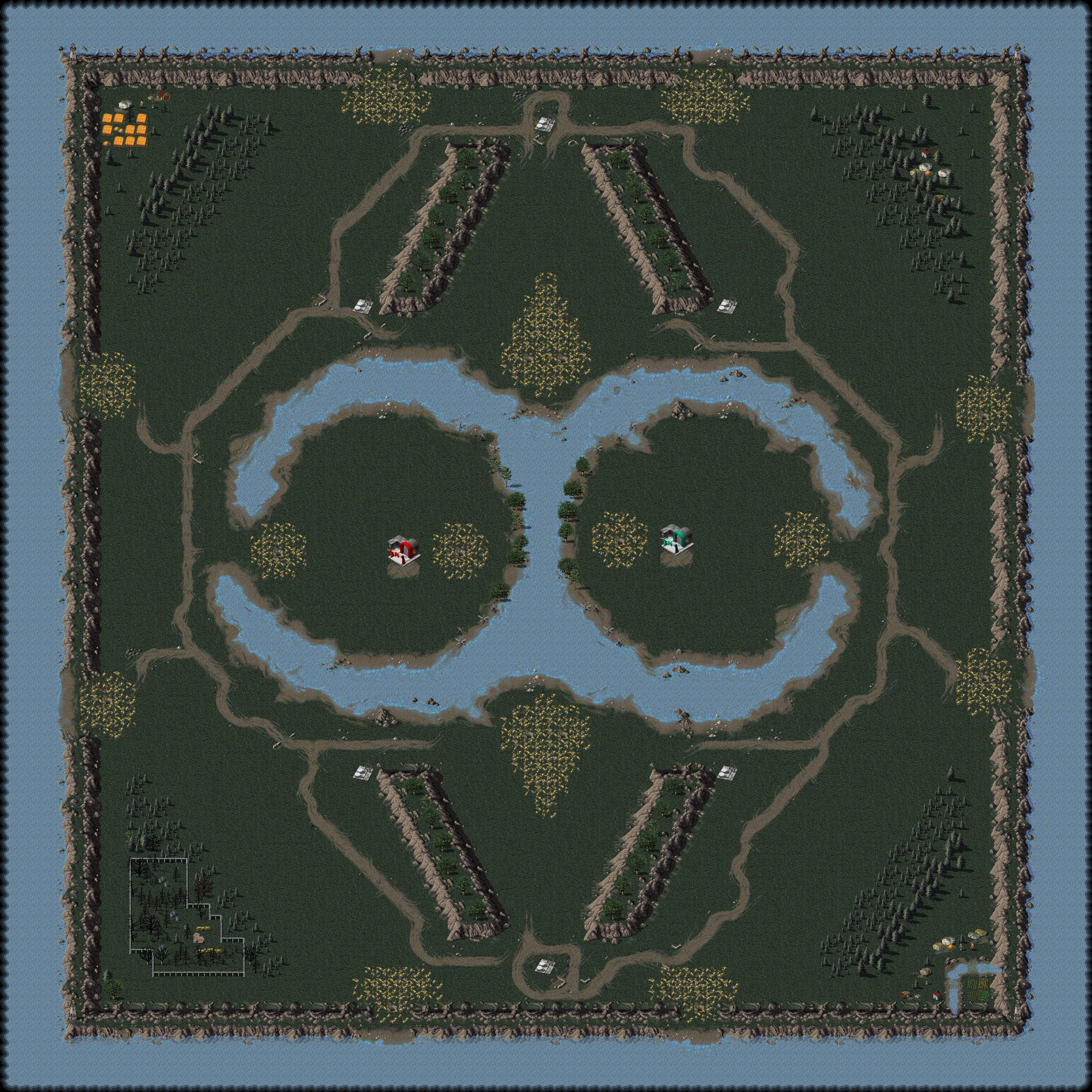 Singles map with ample opportunities for naval combat, long-range attacks, and harvester harassment.