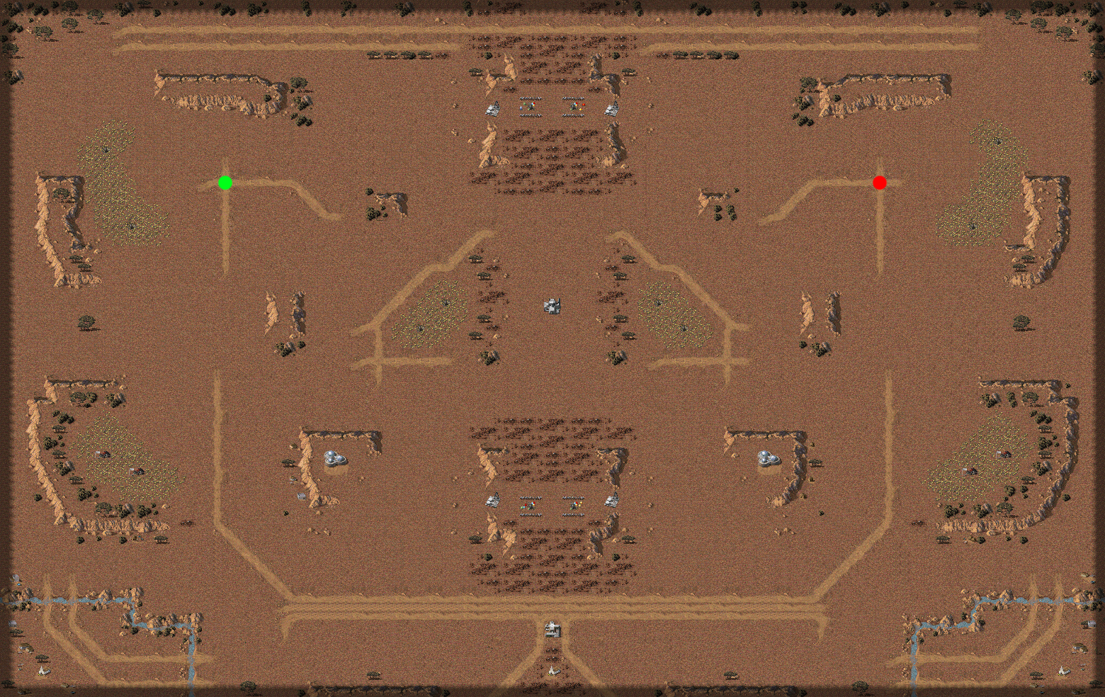 The map has too many details on it, which makes it a bit chaotic visual-wise. Also the mine count is too much for 1v1, with 9 ore and 2 gem mines per player. May easily remove side 2-mine patches.