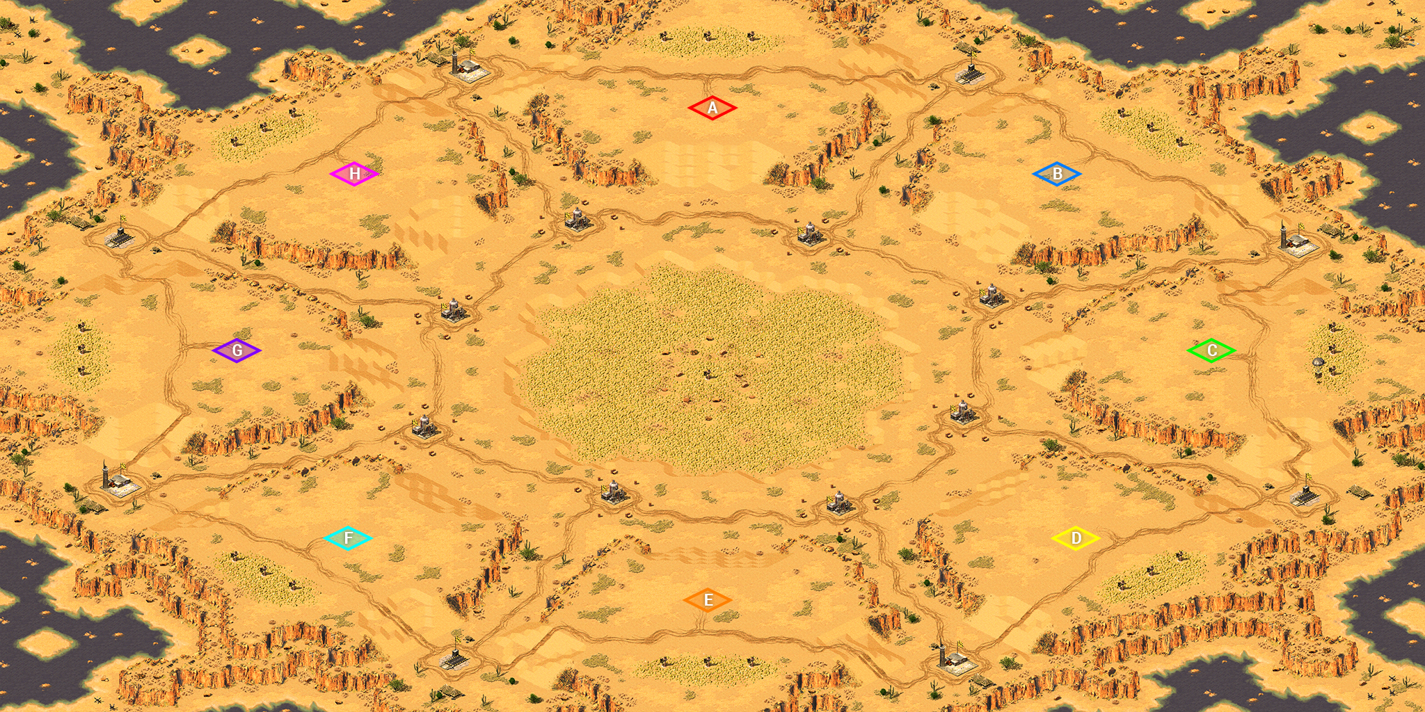 Remake ( demake ) of a Command and Conquer 3 Tiberium Wars map "Rocktagon". Suitable for 4 players FFA, 8 players FFA, 2v2 and 4v4.