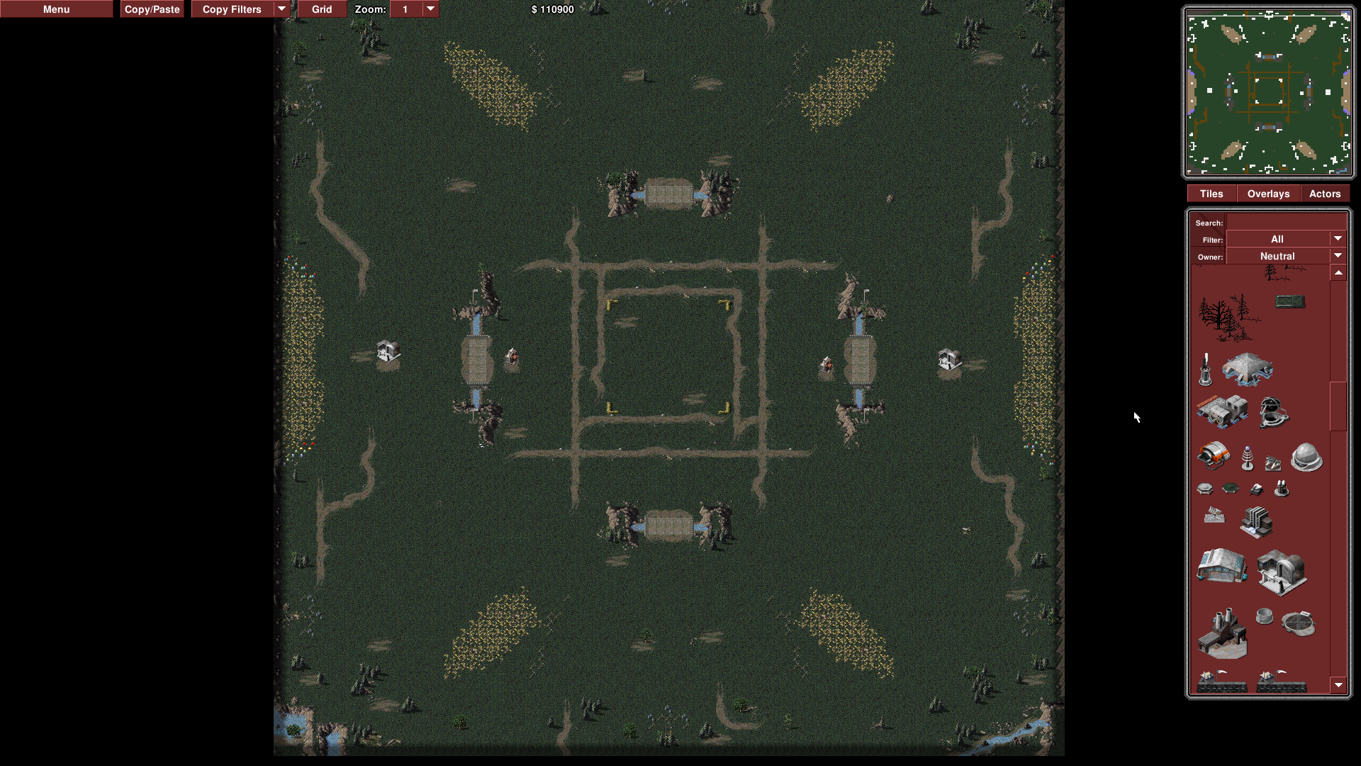 Each spawn has 2 big expansions which are the same distance from spawn. There is the same amount of mines at spawn as the big expansions, so it'd be less of a loss if the main is destroyed. There are 6 choked-up mines along the periphery which are behind fences. Each one works at around 1/2 efficiency. There are no oils. The map has roughly 15 ore mines equivalent in ore production, but makes up for it with an above average amount of ore.