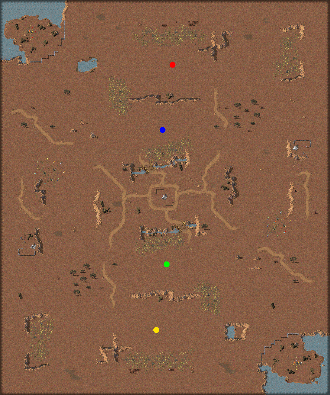 An attempt on an engaging 2v2 map layout. Team spawns are separated by a cliff, but share a double-mine ore patch. Middle is narrow to allow faster army rotation between flanks.